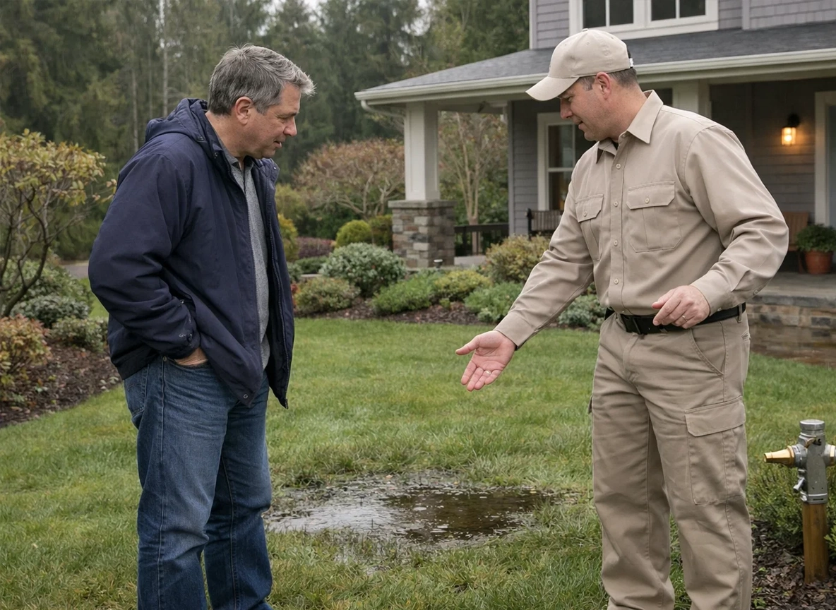 Bainbridge Island homeowner reviewing main water line risk with plumber